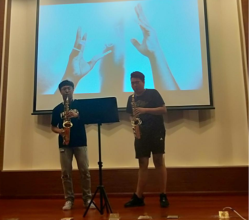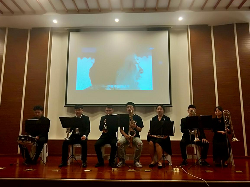 緊接著《蘇北調變奏曲》沉穩的音韻、青海民歌《花兒》忽快忽慢的節奏、《阿萊城的姑娘》樸實甜美的愛情、輕婉柔和的《貝加爾湖畔》、讓觀眾對傳統管弦樂有了一定的認識與了解。當《亮劍》視頻播放時,全場安靜,“開炮!開炮!”...小軍鼓響起瞬間將大家帶入劇情,中國軍隊不卑不亢的軍魂震撼心神,銅管之間樂聲的配合更是叫人熱血沸騰!最后曲末是薩克斯的《Handclap》,俗稱《98K》,低沉的音調,配上潮流的曲風,觀眾與演員一起互動,燃爆全場,別有一番滋味。