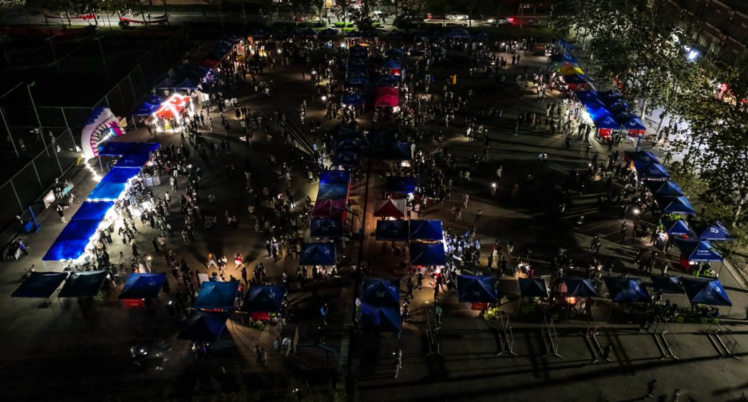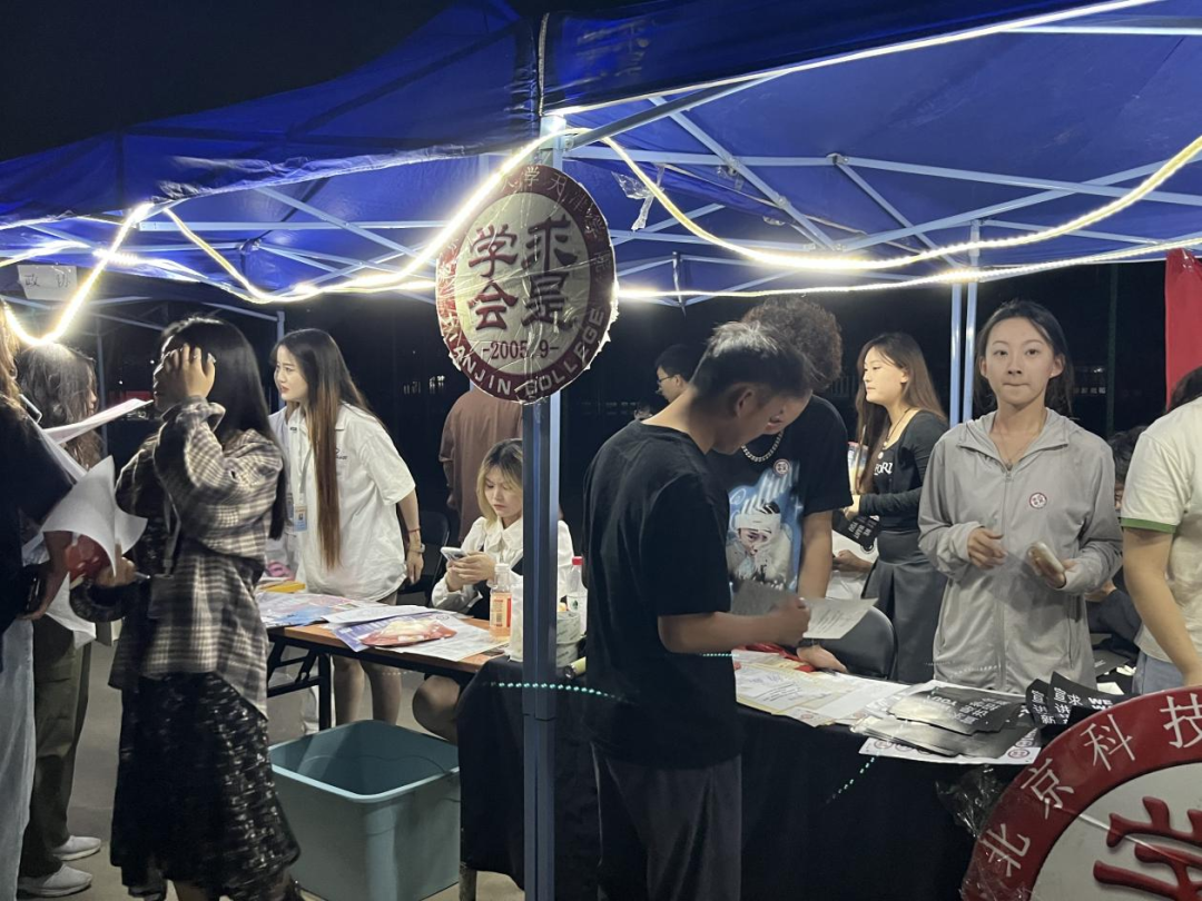 夜幕降臨,招新現(xiàn)場依舊熙熙攘攘,光亮的燈帶閃耀到每位同學的心中。