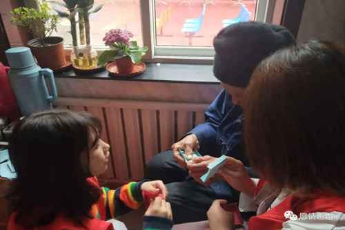 志愿者們懷揣著一顆顆期待與敬重的心,在經過四十分鐘的車程后,大家到達了敬老院。在敬老院負責人的帶領下,大家三五成群進入老人房間,和老人們聊關于他們的日常生活和曾經發(fā)生過的故事,同時志愿者們還教老人如何制作折紙果盤。在敬老院有一位老奶奶今年八十多歲,雖然眼睛看不太清,但在看到志愿者的褲子被磨破了一個洞后,仍堅持著拿針線要為他把破洞縫上,大家無一不被老人的真誠所感動。許多老人聽說大家等會要表演,都早早地從房間出來坐在舞臺下等著志愿者們演出,大家在表演節(jié)目的同時也將我們提前準備好的水果等愛心物品一一送給老人,看著老人們一個個面帶著笑容為大家鼓掌的樣子,每個人都覺得這段經歷是值得的。