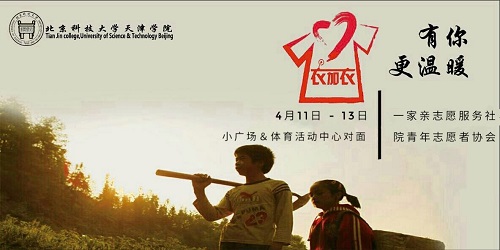 2017年4月11日至13日,北京科技大學天津學院青年志愿者協會與寶坻區“一家親”志愿服務社聯合開展了為期三天以“衣加衣,我們一直在行動”為主題的舊衣捐贈再利用環保公益活動。本次活動共募集愛心物資120余袋,包括羽絨服、毛衣、絨衣、外套等衣物共計7500余件,并將全部捐贈給承德市平泉縣山區的貧困家庭。