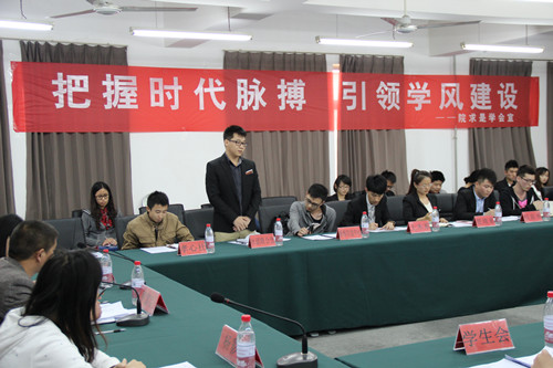 研討會(huì)開(kāi)始后,求是學(xué)會(huì)代表做引入性發(fā)言,倡導(dǎo)青年學(xué)生應(yīng)該牢記時(shí)代重托,從根本著手,建設(shè)優(yōu)良學(xué)風(fēng)。土木系代表閆希曄以當(dāng)前的考風(fēng)考紀(jì)和學(xué)風(fēng)問(wèn)題為切入點(diǎn),引出終身學(xué)習(xí)才是學(xué)習(xí)的根本,告誡當(dāng)代大學(xué)生要以學(xué)習(xí)充實(shí)青春,用知識(shí)澆灌歲月;材料系代表何歡歡則以“發(fā)揮干部先進(jìn)性,爭(zhēng)當(dāng)學(xué)習(xí)排頭兵”為主題,從“小處著手、以點(diǎn)帶面”,“宣傳教育、從我做起”多方面為要旨進(jìn)行探討;而機(jī)械系代表?xiàng)蠲鬏x則以“牢牢堅(jiān)持學(xué)習(xí)之本,緊緊把握學(xué)風(fēng)之根”為主題,從機(jī)械專業(yè)的角度出發(fā),提出要先做人后做學(xué)問(wèn)的觀點(diǎn);信息系代表雷壘論述則更為實(shí)際,他根據(jù)“以學(xué)為基、以學(xué)立行”這一主題,講到首先應(yīng)該從班級(jí)做起,做到充分調(diào)動(dòng)廣大同學(xué)的主觀能動(dòng)性,最后達(dá)到養(yǎng)成良好的職業(yè)道德的目標(biāo);之后,經(jīng)濟(jì)系代表吳鵬宇和藝術(shù)系代表馮倩蔚則分別以“準(zhǔn)確訂立學(xué)習(xí)目標(biāo)、圓滿實(shí)現(xiàn)人生規(guī)劃”和“勤學(xué)苦讀求真知、深思明辨建學(xué)功”為主題進(jìn)行了發(fā)言。自由討論環(huán)節(jié),與會(huì)代表積極發(fā)言,闡述自身觀點(diǎn),提出問(wèn)題,分析問(wèn)題,現(xiàn)場(chǎng)氣氛熱烈而有序,團(tuán)委副書(shū)記潘柏夷對(duì)主題發(fā)言進(jìn)行點(diǎn)評(píng),同時(shí)強(qiáng)調(diào)學(xué)生干部應(yīng)積極響應(yīng)和帶頭引領(lǐng)學(xué)風(fēng)建設(shè)。大會(huì)最后,團(tuán)委書(shū)記羅富臣對(duì)本次研討會(huì)進(jìn)行總結(jié),羅老師分別從為什么要讓學(xué)生干部談學(xué)風(fēng)、為什么要把學(xué)風(fēng)建設(shè)和把握時(shí)代脈搏相結(jié)合、學(xué)生干部應(yīng)該如何引領(lǐng)學(xué)風(fēng)建設(shè)三個(gè)方面進(jìn)行總結(jié),并指出當(dāng)前要緊緊以實(shí)現(xiàn)中華民族偉大復(fù)興的中國(guó)夢(mèng)這一長(zhǎng)遠(yuǎn)目標(biāo)為引導(dǎo),立足實(shí)際,充分發(fā)揮學(xué)生干部的帶頭作用,從我做起、做好表率,做到成績(jī)達(dá)標(biāo)、帶隊(duì)有為,同時(shí)能剖析不足、尋找對(duì)策,為自身發(fā)展和學(xué)院建設(shè)不斷努力。伴隨著全場(chǎng)熱烈的掌聲,本次研討會(huì)圓滿結(jié)束!