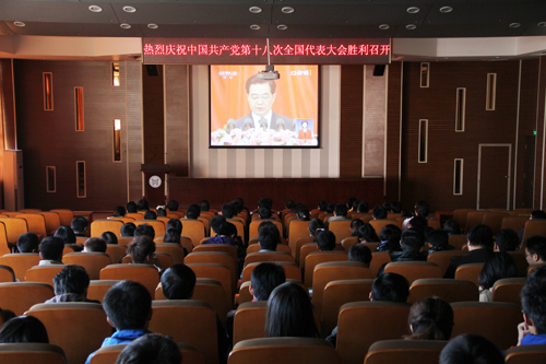 在全黨和全國人民的期盼中,中國共產黨第十八次全國代表大會于11月8日上午在北京人民大會堂如期召開。上午8時30分,北京科技大學天津學院團委組織團委干部及青年學生200余人在學院學術報告廳觀看了中國共產黨第十八次全國代表大會開幕儀式的現場直播盛況。大會開幕后,全場起立齊唱中華人民共和國國歌,胡錦濤總書記作報告時,大家熱切的目光聚焦在投影屏幕上,邊聽邊作著筆記。