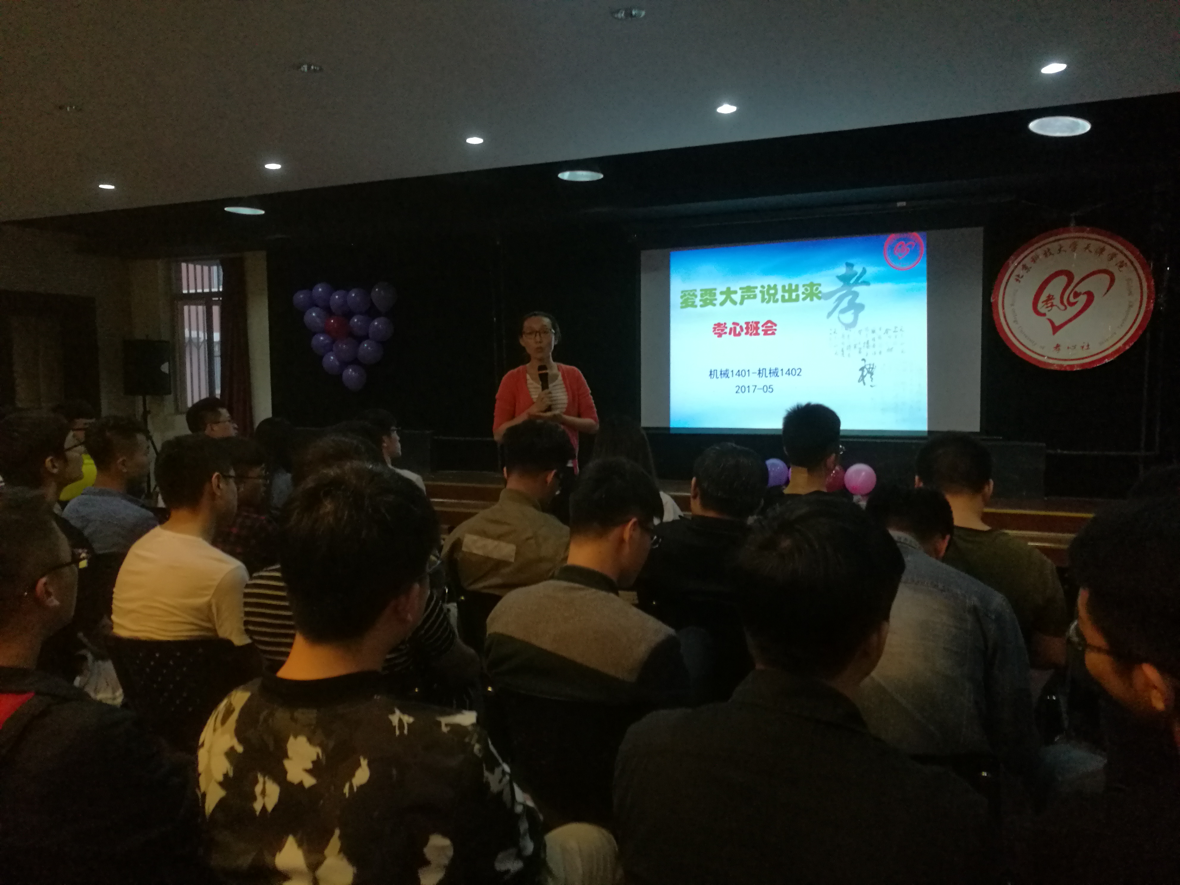 5月2日18點,孝心社主辦的“愛要大聲說出來”孝道主題教育系列活動在學(xué)生活動中心舉行,本次活動走進機械系機械1401和1402班。機械系黨總支書記郭雅娟,14級學(xué)生輔導(dǎo)員尤文婷參加了此次活動。