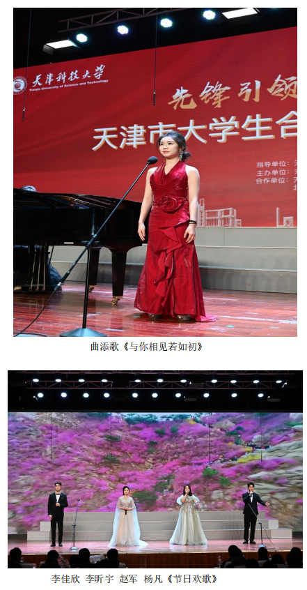 當天,天津科技大學濱海校區(qū)千人禮堂內(nèi)彌漫著濃郁的藝術氣息,在我校學生藝術團合唱團指導教師,崔帥老師的帶領下,我校學生合唱團演唱了在2024年天津市學校文藝展演中榮獲一等獎第一名的作品《哭泣的草原》,合唱團成員李佳欣、李昕宇、趙軍、楊凡帶來的四重唱《節(jié)日歡歌》,李佳旺、曲添歌演唱《我不知道風在哪一個方向吹》、《與你相見若如初》等膾炙人口的聲樂作品,將音樂會一次次推向高潮,團員們用歌聲展現(xiàn)了我校實施美育浸潤的高效成果。