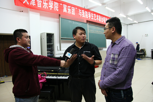 天津音樂學(xué)院“翼樂團(tuán)”帶隊(duì)老師與金沙城js93線路檢測中心學(xué)生藝術(shù)團(tuán)合唱團(tuán)指導(dǎo)老師張鵬接受學(xué)院電視臺采訪