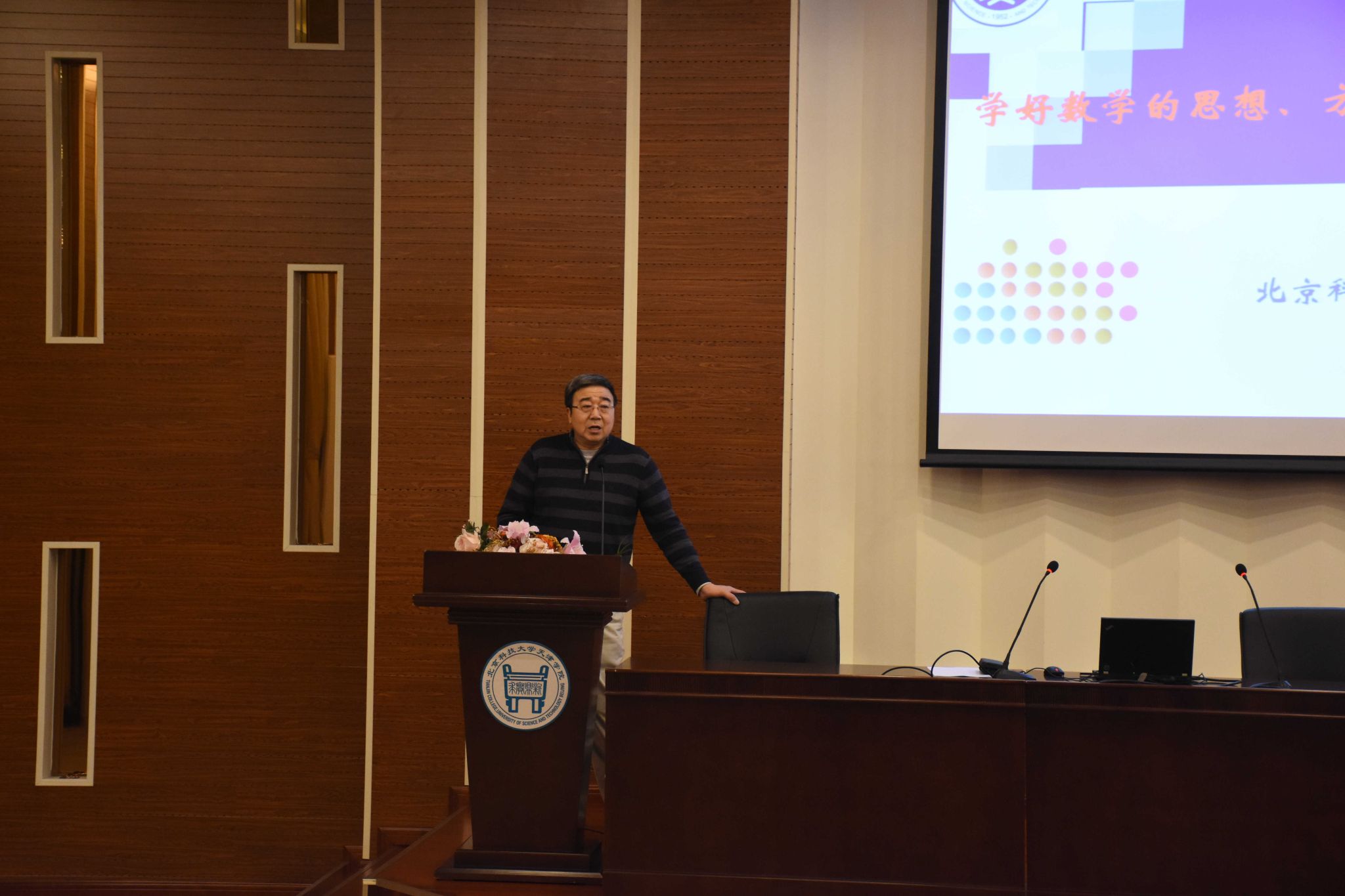 2015年12月23日晚上,基礎部邀請北京科技大學數理學院教授、北京市教學名師、中國高等教育學會教育數學專業委員常務理事、北京市數學學會常務理事、北京市數學學會大學工作委員會副主任、北京經濟數學學會副理事長、國家獎勵辦咨詢專家鄭連存教授,于理工圖書館學術報告廳,開展了一場以“學好數學的思想、方法,啟迪智慧人生”為主題的學術講座。基礎部主任范玉妹、副主任李徽、北京科技大學數理學院張志剛教授、基礎部全體教師以及300余名15級學生代表參加了本次講座。