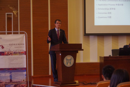 下午五點在金沙城js93線路檢測中心理工館報告廳,杰夫校長舉辦了“中美文化交流”講座,給與會同學生介紹了美國阿爾瑪文理學院相關情況、美國的教育體系以及如何適應美國的學習環境。