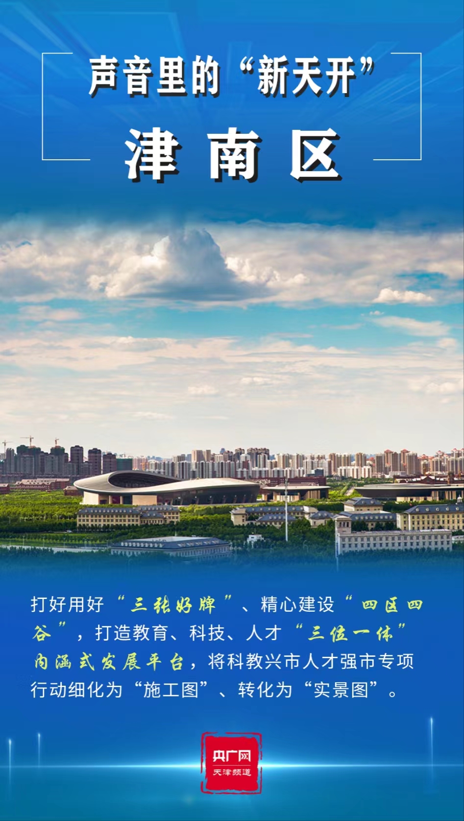 央廣網(wǎng)天津5月12日消息 2023年是全面貫徹黨的二十大精神的開(kāi)局之年。寅末卯初,天津市委經(jīng)濟(jì)工作會(huì)議召開(kāi),高站位、高標(biāo)準(zhǔn)謀劃“十項(xiàng)行動(dòng)”,逐步將黨的二十大擘畫(huà)的宏偉藍(lán)圖推向?qū)嵕?。其中,一個(gè)響亮的名字——“天開(kāi)高教科創(chuàng)園”(以下簡(jiǎn)稱(chēng)“天開(kāi)園”)引發(fā)廣泛關(guān)注?!疤扉_(kāi)”,既融合了南開(kāi)大學(xué)、天津大學(xué)兩所百年名校,亦有得天獨(dú)厚、開(kāi)拓進(jìn)取等寓意,為人們帶來(lái)無(wú)限想象空間,可謂石破“天開(kāi)”。