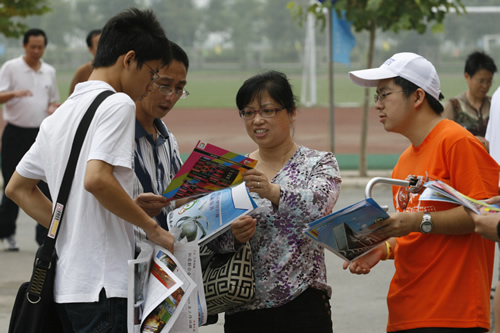 志愿者將學(xué)院報(bào)紙送到新生和家長的手中