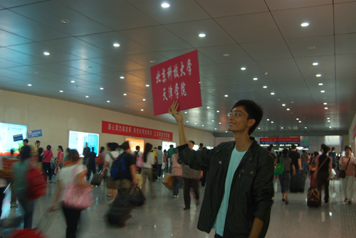 志愿者們不辭辛苦,手持接站牌,在火車站內(nèi)迎接新生
