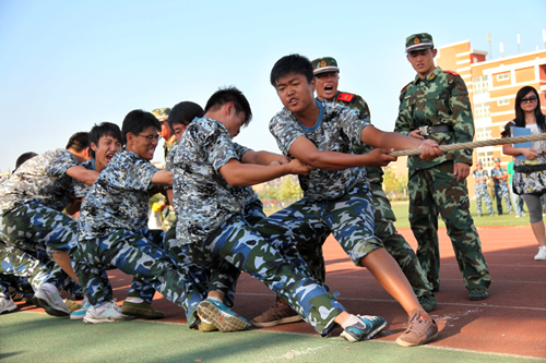 比賽以連為單位進行,同學們爭相參加,男生組有5支隊伍,每支20人,女生組有3支隊伍,每支20人組成拔河隊。隨著哨音響起,比賽開始了,吶喊聲隨即震耳欲聾,場上熱情高漲。隨即教官們之間的較量、教官與同學之間的友誼賽更是把本次比賽拉上了高潮。
