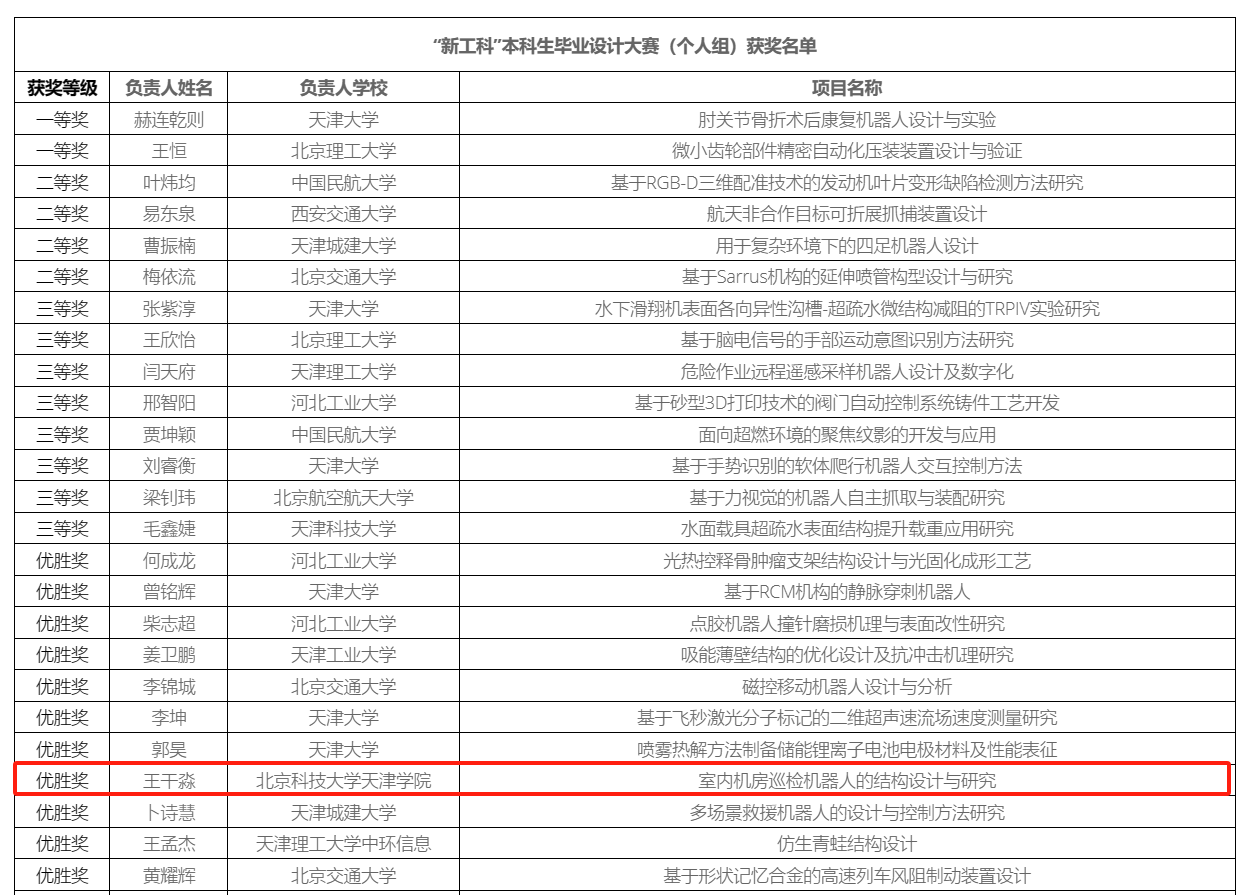 近日,由天津市教委主辦的第四屆“新工科”本科生畢業設計大賽(暨第十八屆“廣數杯”本科生畢業設計大賽)全國總決賽圓滿落幕。金沙城js93線路檢測中心智能制造學院機械工程專業2024屆畢業生王干淼的畢業設計《室內機房巡檢機器人的結構設計與研究》(指導教師:班嵐副教授)榮獲優勝獎,這是金沙城js93線路檢測中心學生在此項賽事中首次獲獎。