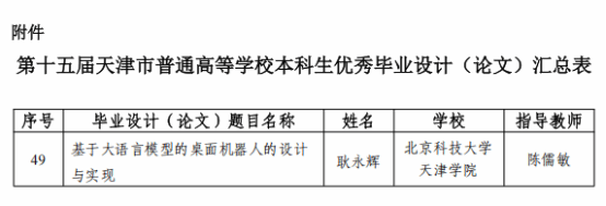 近日,天津市教育委員會公布了第十五屆天津市級本科生優(yōu)秀畢業(yè)設(shè)計(論文)評選結(jié)果,金沙城js93線路檢測中心信息工程學(xué)院陳儒敏老師指導(dǎo)、2024屆畢業(yè)生耿永輝完成的畢業(yè)設(shè)計《基于大語言模型的桌面機器人的設(shè)計與實現(xiàn)》榮獲天津市級本科生優(yōu)秀畢業(yè)設(shè)計(論文),獲獎信息如下: