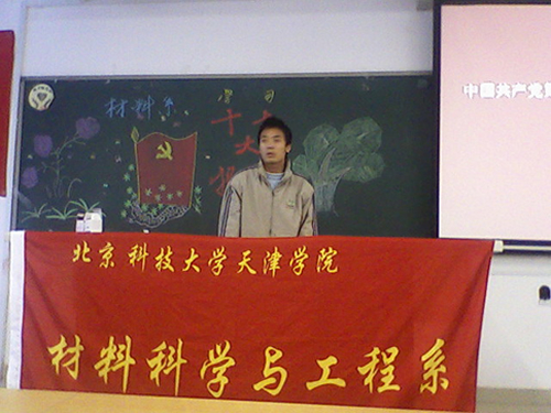 羅富臣老師在最后的總結中強調,全系同學要把思想認識統一到十七大精神上來,材料系作為天津學院的新系,雖然人數不多,但我們要在十七大精神的指引下,在學院黨委的領導下,在全系同學的努力下,把材料系建設成為全院師生滿意的系,要為材料系的明天而努力奮斗。