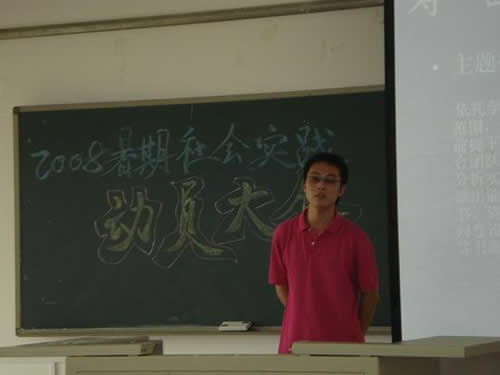 4點(diǎn)動員會正式開始。首先,團(tuán)委副書記羅富臣向到場的同學(xué)簡單介紹了此次動員大會的主要內(nèi)容及意義,之后,2005級學(xué)生會主席呂林峰結(jié)合自己在2006年暑期社會實(shí)踐成功的經(jīng)歷與現(xiàn)場同學(xué)作經(jīng)驗(yàn)交流。在2006年暑期社會實(shí)踐中,學(xué)生會組織的“保護(hù)母親河”行動實(shí)踐團(tuán)取得了良好的效果,他通過制作的PPT和視頻讓同學(xué)們對社會實(shí)踐有了一個初步的認(rèn)識。