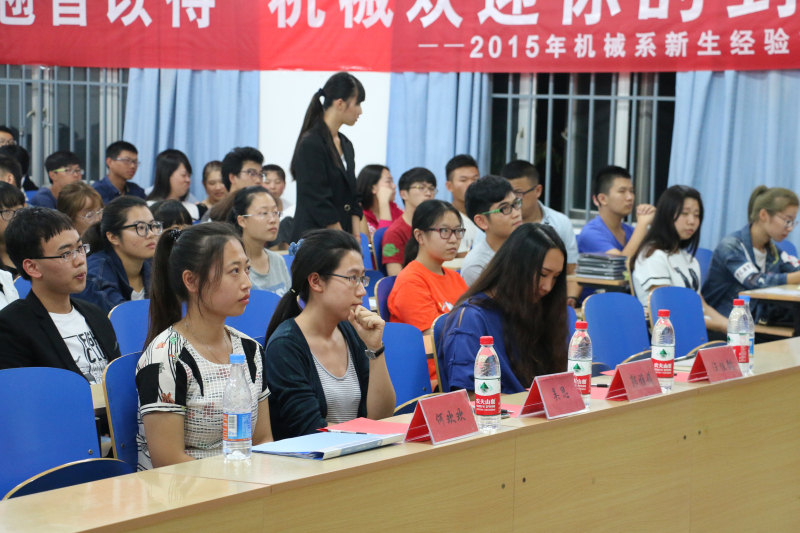 9月16日晚7點,在金沙城js93線路檢測中心8教101室,機械系舉辦了2015屆新生經驗交流大會,機械系黨總支書記郭雅娟,機械系團委書記吳思,15級導員何歡歡、汪佳懿,Mooc學社主席趙忠,以及機械系分團委學生會主席團和部長團出席此次大會。