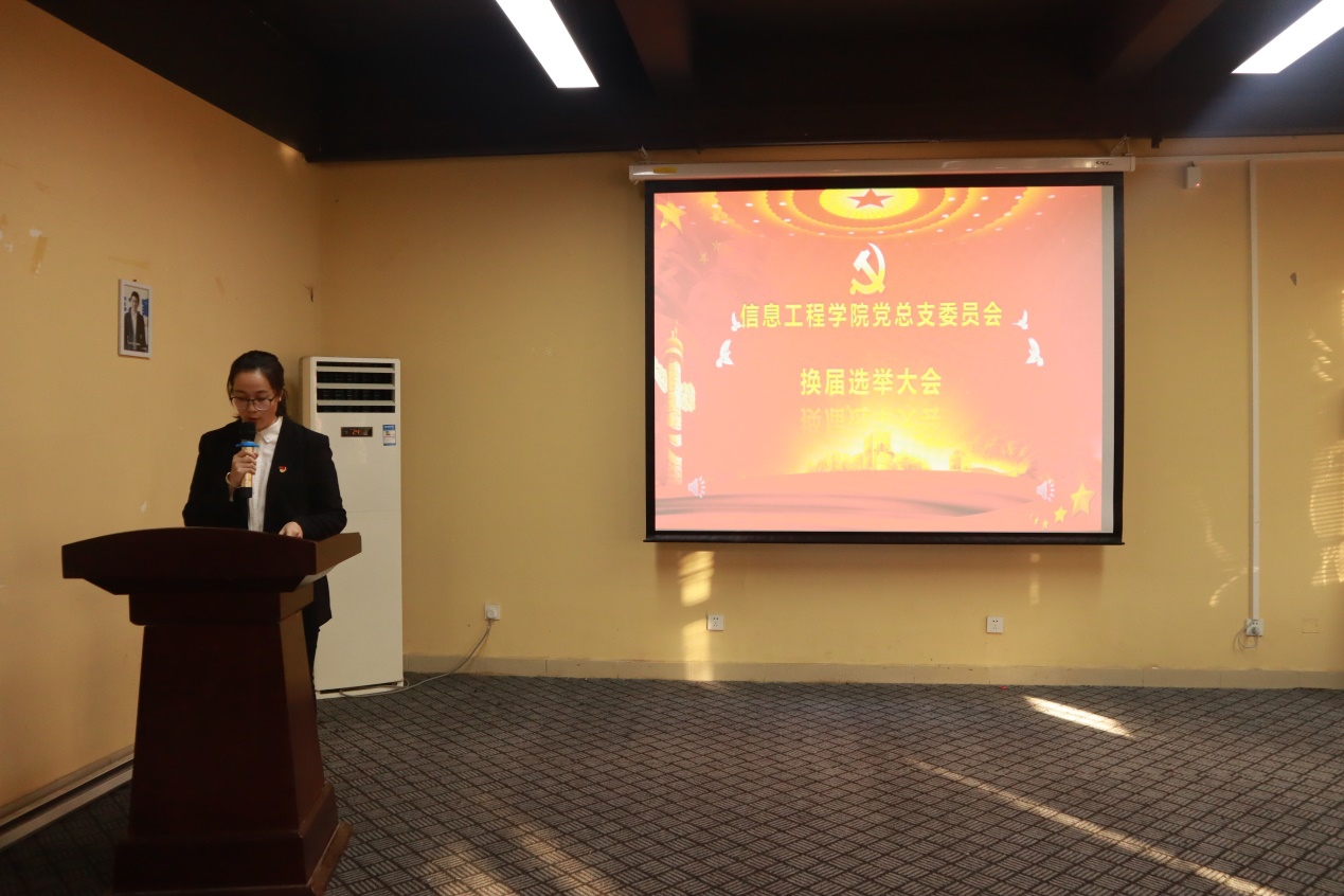 首先主持人李俊杰向大會報告實到黨員人數,應到正式黨員46名,實到正式黨員42名,符合換屆選舉的有關規定,并介紹了本次會議的流程。夏華一同志代表信息工程學院總支部委員會向大會作了工作報告,全面總結了三年來信息工程學院黨總支在黨建、思想政治教育以及教學工作等方面的情況,并對信息工程學院未來三年發展提出總體展望。