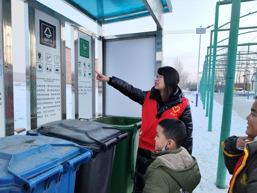 隨后,志愿者帶著孩子們來到村里的垃圾分類回收點,讓小朋友們親自動手進行垃圾分類操作,使他們在實踐中掌握垃圾分類的技能。最后,志愿者給孩子們留了一個小作業:把所學的垃圾分類知識帶回家,帶動更多人參與垃圾分類。