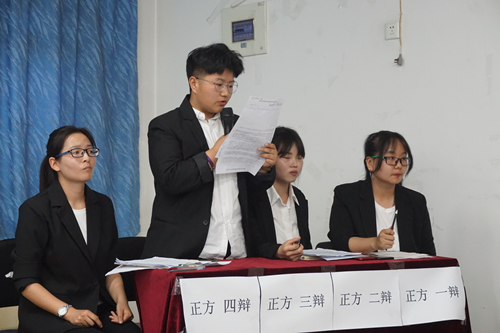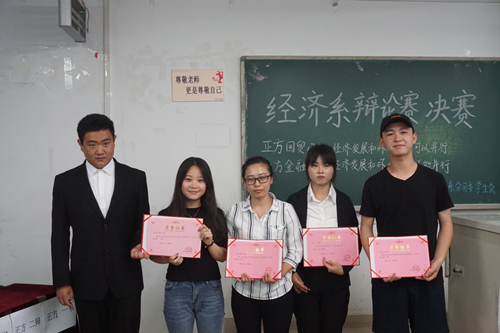 此次決賽在金融1701班和國貿1703班兩隊之間展開。在雙方簡潔的自我介紹后,比賽正式開始。正方國貿1703班認為“經濟發展與環境保護可以并行”而反方金融1701班則堅持“經濟發展與環境保護不可并行”的觀點。雙方辯手在立論,攻辯,駁立論,自由辯論,總結陳詞的環節中思路清晰,引經據典,字字珠璣,使現場氣氛迅速升溫,在自由辯論的環節中雙方選手就辯題展開更深層次的辯論,個個妙語連珠,舌戰蓮花的辯論一次次將比賽推向高潮。最終2018年經濟系辯論賽的冠軍為金融工程1701班,亞軍為國貿1703班,季軍為國貿1701班。