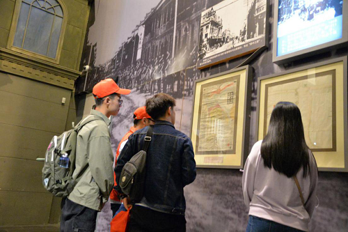 “復興之路”基本陳列里的1200多件(套)珍貴文物、870多張歷史照片以及逼真的戰斗場面吸引了在場的同學們,他們時而駐足觀看拍照留念,時而低頭思考記錄感想,被帶回了近代以來跌宕起伏、波瀾壯闊的難忘歲月。