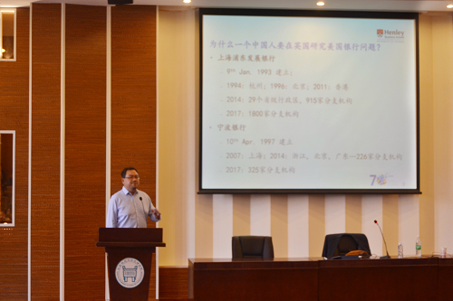 講座過程中韓亮教授最先講述其作為一名華人在英國研究美國銀行問題的原因,隨后教授更為精細的講解了浦東銀行的發展狀況和發展方向,緊接著用兩個研究案例分析了美國銀行的市場與發展。最后韓亮教授辯證講解了銀行競爭和壟斷兩方面的不利點。