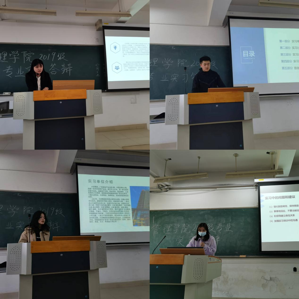答辯開始前,各答辯組導師介紹了本次答辯流程、注意事項、答辯分組情況。答辯同學依次上場,陳述實習經歷、實習內容、實習體會等內容;答辯過程中,面對指導老師提出的各類問題對答自如,獲得了指導老師們的認可與贊賞,體現了管理學院學子踏實、自信、向上的良好精神風貌。