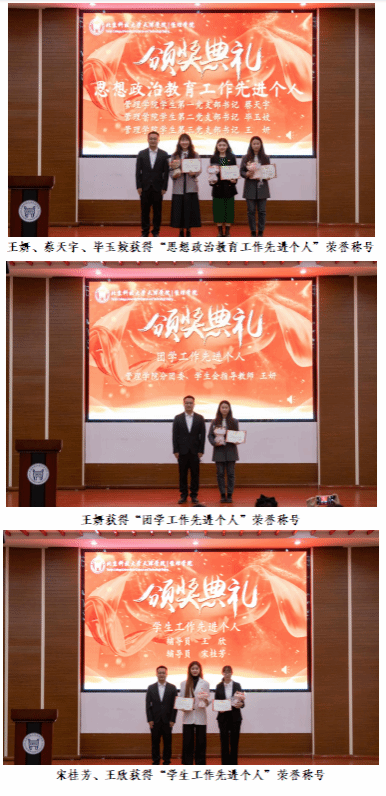 此次表彰大會分別對學(xué)院榮獲“教學(xué)比賽先進個人”、“學(xué)生工作先進個人”等9個類別獎項的教師,以及榮獲各類獎學(xué)金和榮譽稱號的學(xué)生代表和集體進行了表彰。