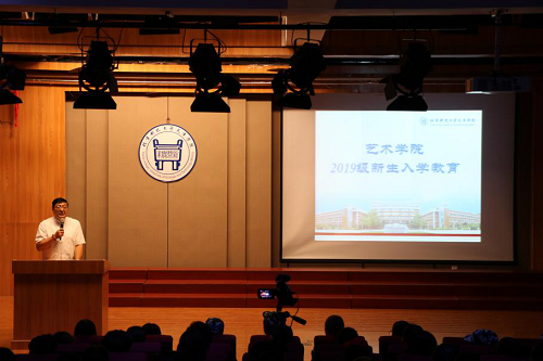 胡寶嘉院長介紹了藝術學院的基本情況,希望2019級新生“學知識、學做人、學做事”,度過充實美好的大學生活。