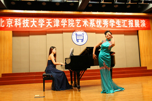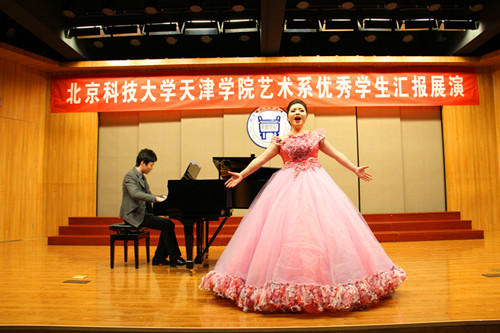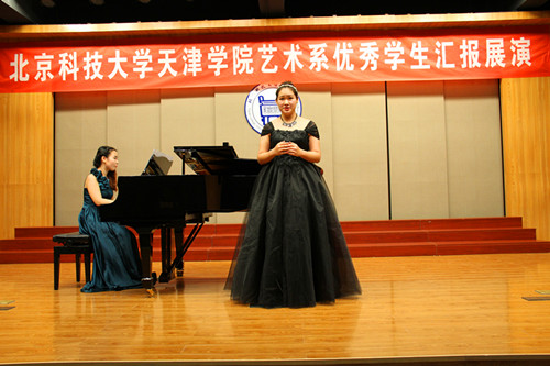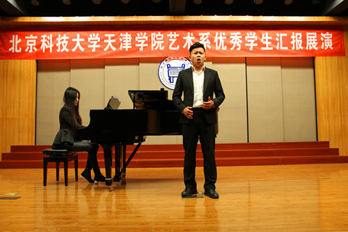 2015年11月11日18:30,北京科技大學天津學院藝術系優秀學生匯報展演在12教學樓弘藝音樂廳舉行。 在藝術系聲樂1401班王明明同學和聲樂1302班魏欣同學的精彩開場白后,演出正式拉開了帷幕。