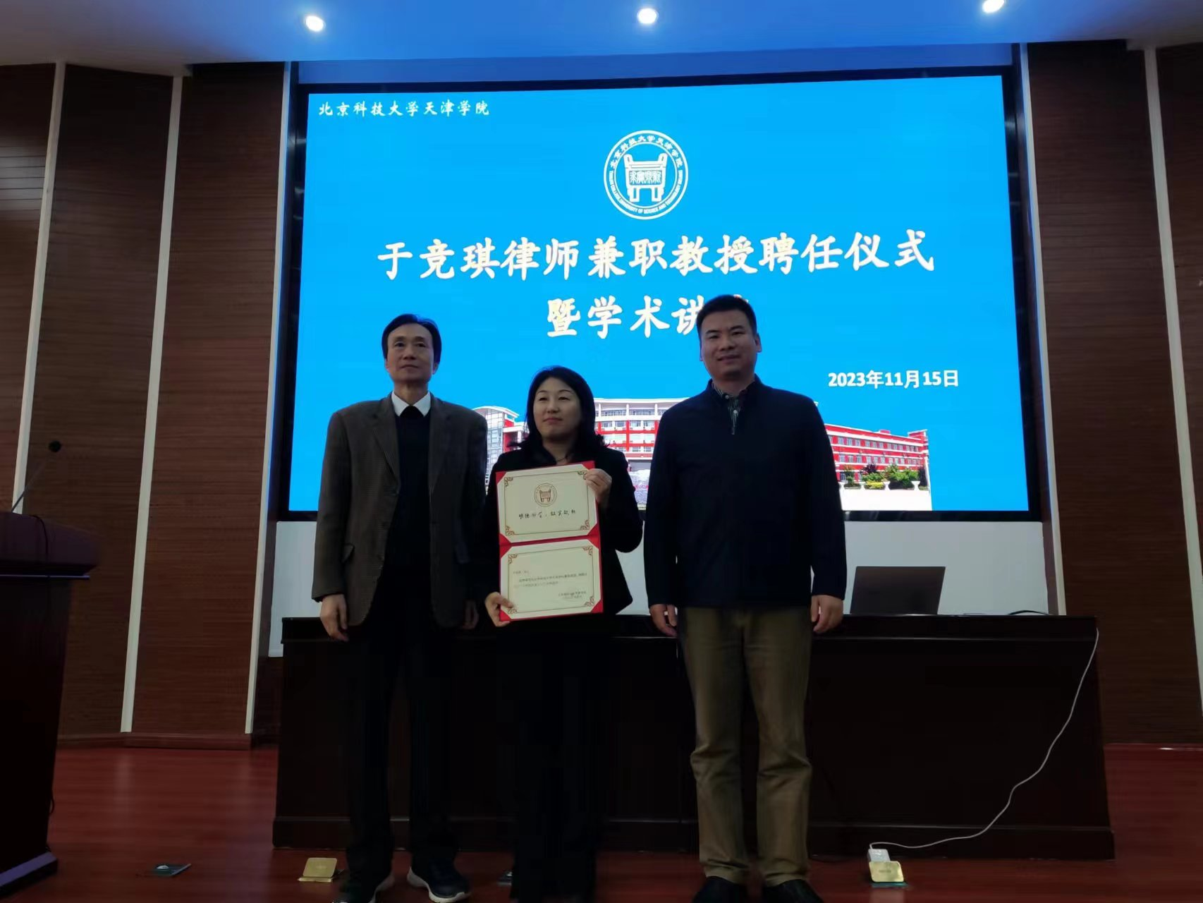 11月15下午3時(shí),北京科技大學(xué)天津?qū)W院于競(jìng)琪律師兼職教授聘任儀式暨法學(xué)論壇系列講座第四期活動(dòng)在理工館報(bào)告廳如期舉行。