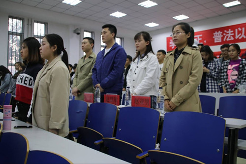 為深入學(xué)習(xí)研究宣傳貫徹十九大精神,推動法律系師生更加自覺地以新思想引領(lǐng)新實踐,為堅持全面依法治國基本方略、深化依法治國實踐作出應(yīng)有貢獻(xiàn)。2018年 4月 25日由法律系分團(tuán)委主辦的“法律系第十三屆模擬法庭”在第8教學(xué)樓生動上演,由學(xué)生們擔(dān)任審判長、審判員、公訴人、辯護(hù)人、被告、人證和法警等角色,通過視頻了解本次案例,模擬審判了一起大學(xué)欺凌致人死亡案件。