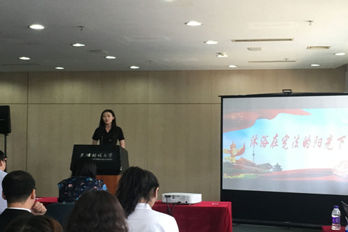 為深入貫徹落實(shí)黨的十九屆二中全會(huì)精神,法律系師生深入開展尊崇憲法、學(xué)習(xí)憲法、遵守憲法、維護(hù)憲法、運(yùn)用憲法的宣傳教育活動(dòng),大力弘揚(yáng)憲法精神,大力弘揚(yáng)社會(huì)主義法治精神,不斷增強(qiáng)師生憲法意識(shí)。法律系5月初起,積極準(zhǔn)備2018年天津市學(xué)生“學(xué)憲法講憲法”主題演講比賽。通過系內(nèi)選拔,最終確立參賽選手為法律系法學(xué)1601班學(xué)生李雨萌,于2018年5月31日在天津財(cái)經(jīng)大學(xué)參加比賽。