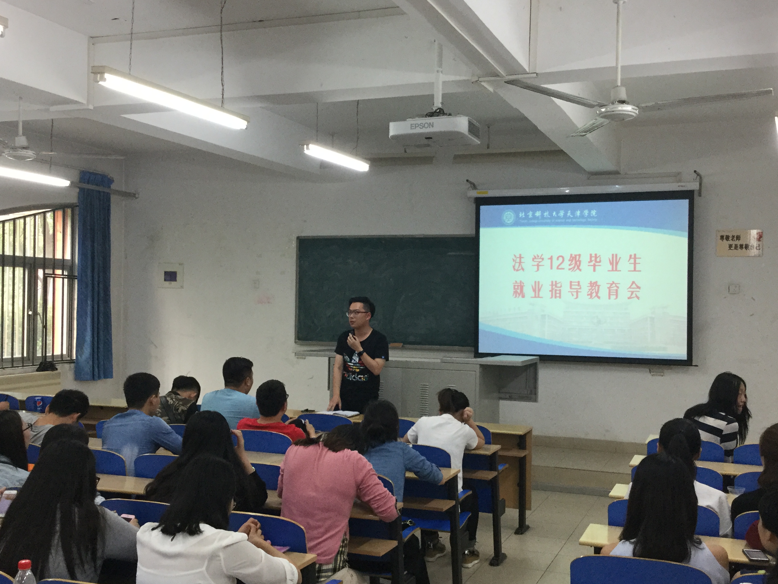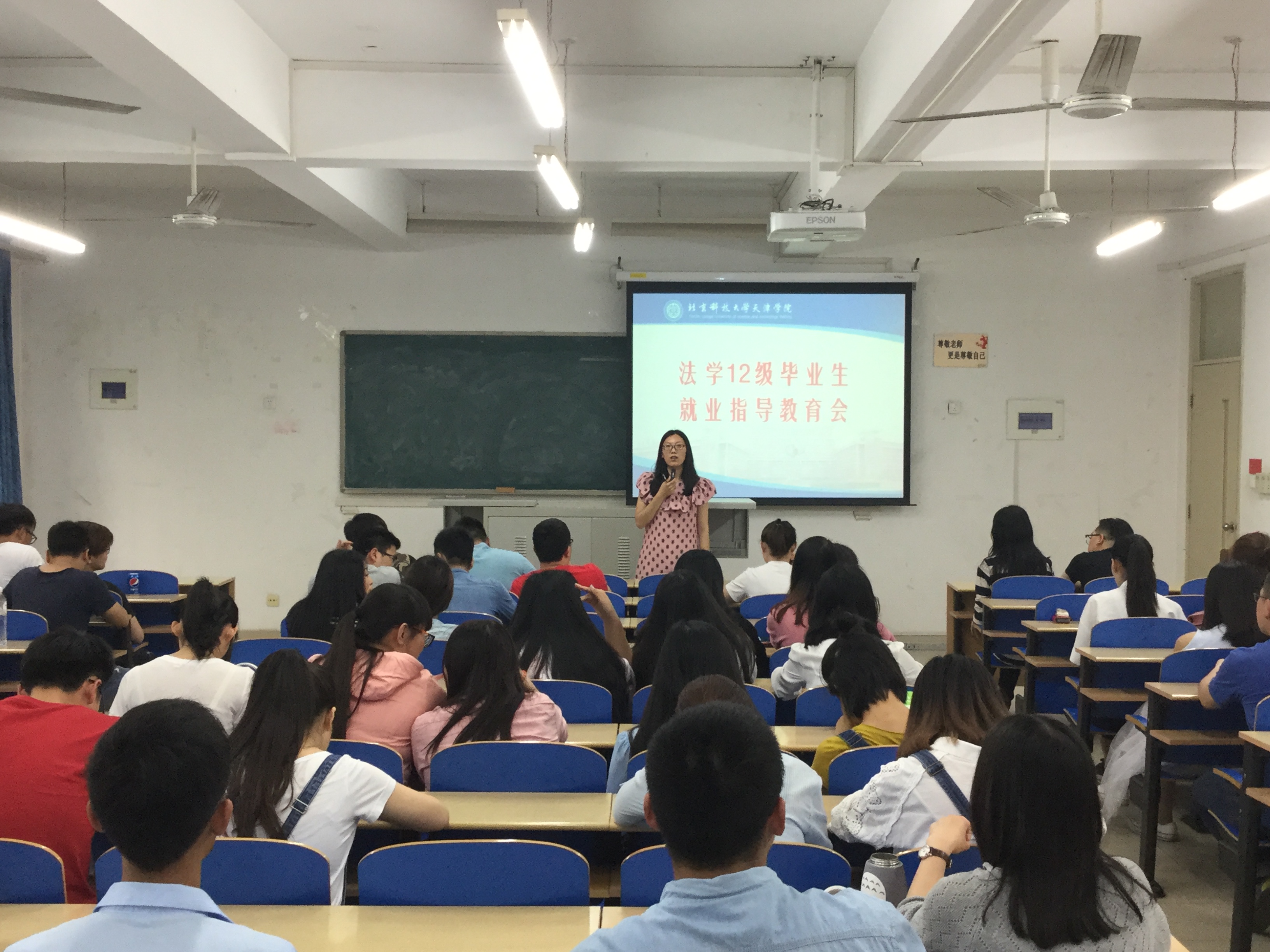 2016年5月11日下午16點,在九教106法律系舉行了2016屆畢業生就業指導教育會,法律系黨總支書記馮海燕、法律系分團委書記閆謖、輔導員助理朱嘉陽以及全體12級畢業生出席了此次教育會。