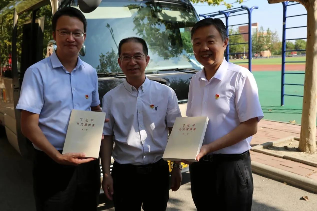 楊明偉局長向?qū)W院贈(zèng)送《習(xí)近平外交演講集》,學(xué)院院長丁煦生、黨委書記葉振楠代表學(xué)院接受贈(zèng)書。