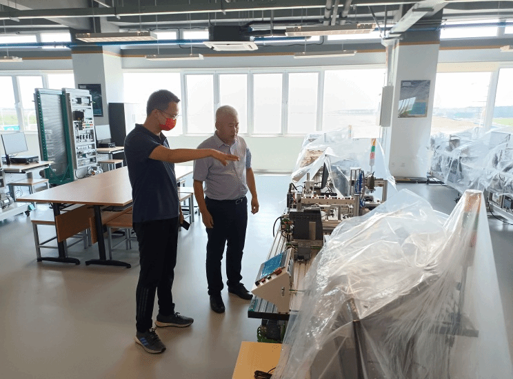 葉振楠書記一行來到天津濱海新區(qū)先進制造職業(yè)技能公共實訓(xùn)中心,在企業(yè)中航教育負責(zé)人的陪同下首先參觀了工業(yè)4.0車間的眾多智能制造設(shè)備,之后參觀了航空制造實訓(xùn)區(qū)了解了實訓(xùn)中心的實訓(xùn)理念、內(nèi)容、流程和要求。