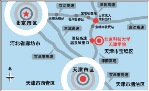 自駕車上津薊高速(薊縣方向)——津薊高速(溫泉城出口駛出)——梅豐公路——祥瑞大街——京津新城(北京科技大學天津學院)
